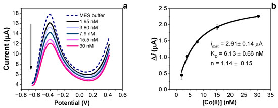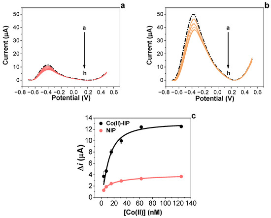 As seen from Figure 1a, in the selected buffer of MES at pH 5, a reduction peak potential is visible at −0.4 V vs. Ag. The observed potential peak can be attributed to the behaviour of the formed polymeric structure that can be modulated after the interaction with Co(II) ions. In fact, we observed a decrease in its current density with increased tested concentrations of Co(II) ions. This result agrees with that observed during the preparation of the sensors compared to the NIP films, which reported a modulated mechanism of polymer electroactivity upon the presence of Co(II) ions during polymer growing. The washing treatment in acidic conditions (0.3 M H2SO4) plays a role in the destruction of hydrogen bonds between the target and polymer based on o-AP [24,25].