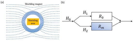 (a) Schematic diagram for the principle of passive magnetic shielding [15]. (b) Schematic diagram of magnetic field diversion.