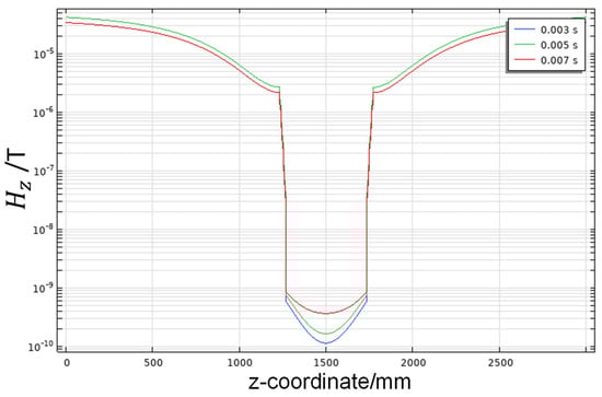 To establish a magnetic shielding system combining active and passive mode, a magnetic shielding barrel is placed inside a three-dimensional coil (as shown in Figure 8). The magnetic shielding efficiency of the system is simulated under a geomagnetic field and a 50 Hz power-line frequency interference magnetic field. Figure 9 shows the magnetic shielding results of the system against the geomagnetic magnetic field after overall compensation along the z-axis. The SE of the system reaches 87.86 dB, which is better than only using active shielding.