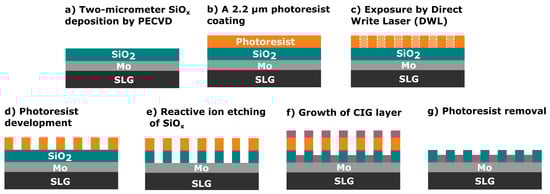 Subsequently, the micro-holes were etched through the SiOx layer by reactive ion etching (RIE) (APS Module, SPTS, Technologies Ltd., Newport, UK) until reaching the Mo back contact layer, which was confirmed through optical microscope inspections and profilometer measurements. Once the etching is completed, two routes can be considered to finish the substrate and deposit the Cu–In–Ga (CIG) precursor. In the first, employed in this work, a CIG layer was grown by sputtering followed by photoresist lift-off, leaving the SiOx layer with the CIG inside the micro-holes. Subsequently, a plasma asher (M360, PVA TePla America Inc., Corona, CA, USA) was used to remove any residual photoresist. The lifted-off material can be subjected to recovery and recycling processes to produce new targets or to separate the CIG materials [28]. The second route involves area-selective deposition or local growth methods, such as electrodeposition [25,26,29], which are recommended for material saving. In this approach, the photoresist removal is performed after the deposition process.