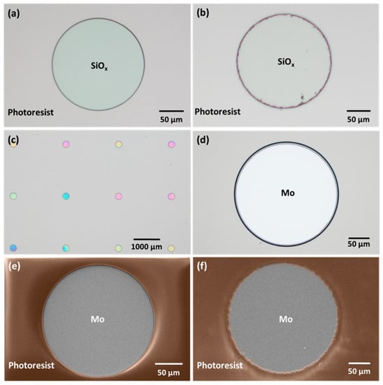 Next, a 2-micrometer-thick SiOx layer was deposited using plasma-enhanced chemical vapor deposition (MPX CVD Module, SPTS Technologies Ltd., Newport, UK) at 300 °C, with a ~45 nm/min deposition rate. Afterward, the substrate SLG–Mo–SiOx is vapor primed with hexamethyldisilazane (HMDS) in the oven prior to the photoresist coating to enhance adhesion to the substrate. Then, a 2200-nanometer-thick positive photoresist layer (AZ4110, Merck KGaA, Darmstadt, Germany) was spin-coated onto the SiOx layer. The micro-dot pattern was exposed by a direct write laser (DWL 2000, Heidelberg Instruments GmbH, Heidelberg, Germany) lithography system, using a laser power of 120 mW and 405 nm wavelength, followed by the photoresist development (AZ400K 1:4, Merck KGaA, Darmstadt, Germany). Alternatively, a mask aligner (MA6BA6, Suss MicroTec, Garching, Germany) was also used for pattern exposure. The DWL creates high-resolution patterns by laser writing directly onto photoresist-coated samples, whereas the mask aligner requires a physical mask to transfer the pattern. In this case, the mask aligner exposure was performed using a 405 nm wavelength and a low-resolution acetate mask instead of a high-resolution acetate or hard mask. The mask aligner had an exposure time of seconds, whereas, for the DWL, it was at least 10 min. The pattern matrix consisted of circular areas of 200- and 250-micrometer diameters with a 2000-micrometer pitch (Figure 2). Furthermore, a test area of 0.012 mm2 was incorporated for characterization purposes.