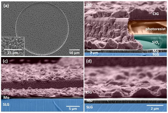 (a) Surface SEM micrograph of CIG precursor micro-dot before photoresist removal acquired at 20 kV; (b–d) cross-sectional SEM micrographs of CIG micro-dot in the SiOx–photoresist matrix acquired at 5 kV. Colors were added in post-processing to improve clarity.