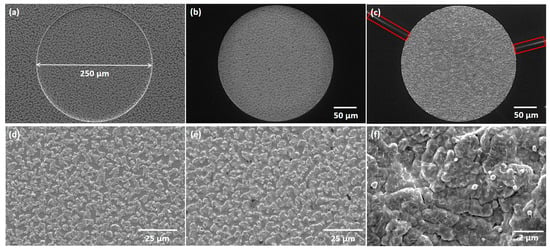 The thermally annealed CIG film underwent a two-stage selenization process at 100 and 480 °C. The SEM micrographs showcase the as-deposited CIG precursor (Figure 8a–d), annealed at 500 °C (Figure 8b–e), and the resulting CIGS micro-dots (Figure 8c–f). The surface of the CIGS micro-dot appears rough and homogenous throughout the micro-dot. It is important to highlight that Figure 8f was acquired following the CdS deposition. A summarized elemental composition is presented in Table 2. The CGI ratio was slightly higher than desired, which can be detrimental to the absorber quality. In high-efficiency solar cells, the CIGS absorber requires a low Ga atomic ratio, approximately 0.2–0.3, and a CGI ratio within the range of 0.88–0.92 [31].