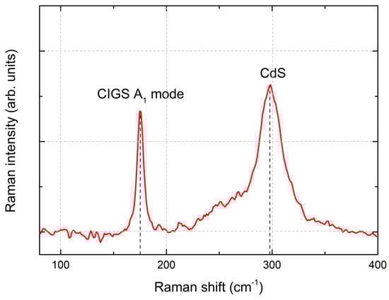 In Figure 9, the Raman spectra of a CIGS micro-absorber reveal dominant peaks centered at about 175 and 300 cm−1. The peak at 175 cm−1 corresponds to the A1 Raman peak of CIGS, associated with the presence of the I-II-VI2 chalcopyrite compounds [32]. This peak has a full width at half maximum (FWHM) of 6.5 cm−1, indicating a high crystalline quality of the CIGS layer, which is slightly higher but comparable to the FWHM of 3.7 cm−1 obtained from a reference single crystal Si sample. Furthermore, the shoulder near 260 cm−1 could be attributed to the presence of Cu-Se compounds such as CuSe or Cu2Se [32,33]. The peak at 300 cm−1 has been identified as the main Raman peak from the CdS buffer layer. After the selenization process, the SiOx layer exhibited some cracking (see red rectangles in Figure 8c), whereas the CIGS micro-dots appeared to remain intact. Given the absence of damage after thermal annealing and in comparable samples after selenization, we hypothesize that mechanical stress incurred during the sample’s breaking into smaller pieces led to cracks during selenization.
