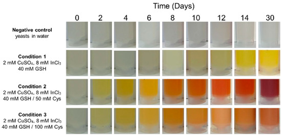CIS nanoparticles kinetics production by F. stepposum. Photographs of tubes containing yeast cells of F. stepposum under indicated biosynthesis conditions at different incubation times at 20 °C. Biosynthesis was conducted using 2 mM CuSO4 and 8 mM InCl3. Variations under different conditions were carried out using different concentrations of GSH and Cys. Negative control corresponds to yeast in water. Condition 1: 40 mM GSH; Condition 2: 40 mM GSH and 50 mM Cys; Condition 3: 40 mM GSH and 100 mM Cys.