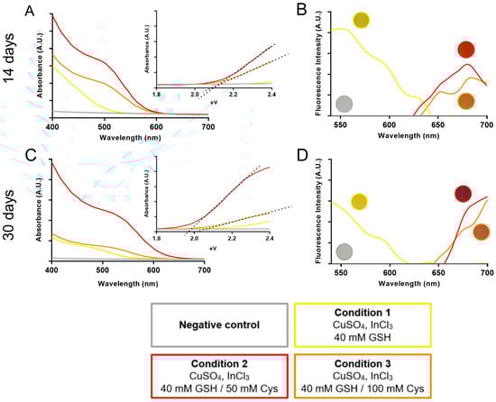 Optical properties of biosynthesized CIS nanoparticles. Absorbance and fluorescence emission spectrum for CIS nanoparticles biosynthesized at different conditions. (A,B) A total of 14 days biosynthesis, and (C,D) a total of 30 days of biosynthesis. (A,C) include band-gap calculation (inset).