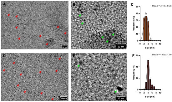 As an additional method for morphology analysis, nanoparticles synthesized with 50 mM cysteine at 14 and 30 days were examined using TEM. Despite spectroscopic and size characteristics aligning with CIS nanoparticles biosynthesized by the biomimetic method [25], TEM micrographs revealed an heterogeneous nanoparticle population (Figure 4A,D), with some nanoparticles displaying triangular-shaped morphology (Figure 4B,E). While most reported CIS nanoparticles are spherical [4,21,25], there are instances of pyramidal-shaped nanoparticles as well [14,75,76]. Nanoparticles synthesized at 14 days exhibited a mean size of 3.4 nm (Figure 4C), while those synthesized at 30 days had a mean size of 4.9 nm (Figure 4F). Consistent with the hydrodynamic size measured by DLS, the nanoparticle size increased with prolonged incubation time. Notably, the biosynthesized nanoparticles were relatively small compared to biomimetic CIS nanoparticles (mean size of 33.5 nm) [25]. However, various synthesis methods for CIS nanoparticles can yield crystals within a wide size range, from 2 nm to 300 nm [77,78], placing the size of biosynthesized nanoparticles within the expected range. Another noteworthy observation is the disparity between the hydrodynamic size measured by DLS and the size measured by TEM. This phenomenon is consistent with findings in other studies involving biological nanoparticles. The variation could be attributed to the diverse forms visualized by TEM (Figure 4) or the biological coating characteristic of biological nanoparticles, both of which influence the hydrodynamic size [79,80].
