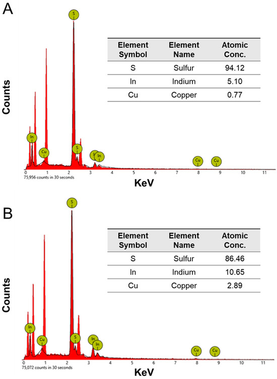 CIS nanoparticles synthesized under condition 2 (50 mM cysteine) at different incubation times (14 and 30 days) underwent EDX analysis (Figure 5). The presence of copper, indium, and sulfur was confirmed, with varying copper/indium ratios determined for each incubation time (0.15 for the 14-day synthesis and 0.27 for the 30-day synthesis). The high sulfur content in the nanoparticles may result from thiol capping provided by both cysteine and GSH used in the biosynthesis, forming part of the organic matter coating inherent to biological nanoparticles [71]. This result indicates an increase in the amount of copper with extended incubation time and that the produced CIS nanoparticles exhibit a non-stoichiometric composition, deviating from the usual 1:1:2 (Cu:In:S) proportions [83,84].