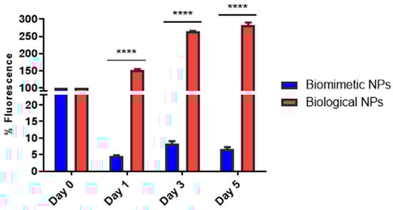 Given that the F. stepposum species was isolated from Union Glacier with continuous exposure to UV light [30], we aimed to explore the photostability of the synthesized nanoparticles. Photostability assays were conducted with CIS biosynthesized nanoparticles incubated for 30 days (condition 2, 50 mM cysteine), given that their spectroscopic characteristics are more closely related to CIS nanoparticles synthesized through the biomimetic method [25]. The photostability of CIS biosynthesized nanoparticles was compared to that of CIS nanoparticles synthesized through the biomimetic method, both subjected to continuous exposure to white light over a 5-day period (Figure 6). Biomimetically synthesized nanoparticles (depicted by blue bars) exhibited a decrease of over 90% in their fluorescence emission after 24 h of light exposure. In contrast, biosynthesized CIS nanoparticles (illustrated by red bars) demonstrated greater stability to light exposure throughout the entire assay and, notably, increased their fluorescence emission with the incubation days. This phenomenon aligns with the concept of photoactivation or photoenhancement observed in other semiconductor nanoparticles like ZnSe and PbS types [85,86,87]. The photoactivation of nanoparticles in aqueous solutions induced by light exposure has been attributed to a process of photocorrosion. During this process, photoinduced charge carriers located at the surface of the nanoparticle interact with oxygen in the solvent. This interaction gradually erodes the atomic-scale topographic flaws on the nanoparticle’s surface, resulting in smoother crystals with enhanced fluorescence emission [88]. While mentions of photoactivation with CIS QDs have been reported in the context of photoelectrochemical studies [20,89], there is a lack of studies exploring photoactivation induced by light exposure on this type of nanoparticle.