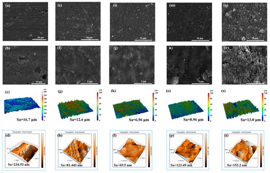 In order to investigate the roughness properties of the films in depth, we used atomic force microscopy (AFM) to characterize the micromorphology of each sample, as shown in Figure 2d,h,l,p,t. The surface roughness of V50 remains the lowest at 69.51 nm, while V100 and V200 continue to show higher roughness values and agglomeration. The films prefabricated at 0 V show an inhomogeneous shape and their three-dimensional morphology retains the rift valley configuration, which indicates that the plasma dispersion failed to fill the debris defects in the NBR.