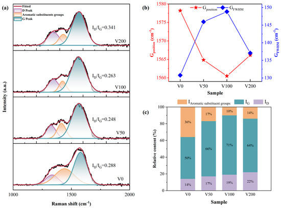 Figure 3. (a) Peak fitting of the Raman curves of each sample under different bias voltages to obtain the Raman curves of each sample and their respective ID/IG values; (b) G peak position and FWHM of each sample; (c) peak area fraction of each sub-peak obtained through Gaussian peak fitting.