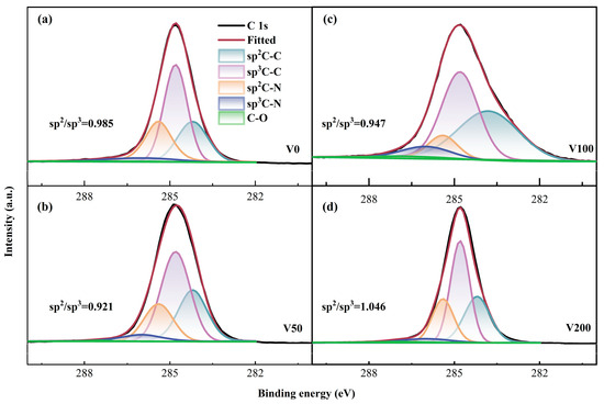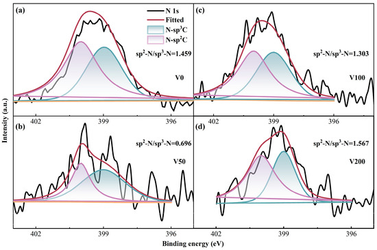 The initial N 1s spectrum underwent deconvolution, revealing two prominent peaks with binding energies of 398.6 ± 0.1 eV and 399.8 ± 0.2 eV, respectively [39]. The peak at the lower binding energy is attributed to the sp3 hybridized C-N bond, while the peak at the higher binding energy corresponds to the sp2 hybridized C-N bond. As depicted in Figure 5, the ratio of sp2 C-N to sp3 C-N initially decreases and then increases with the escalation of substrate bias. This trend indicates that the formation of sp2 C-N structures becomes more favorable as the bias voltage increases. This phenomenon can be explained by the differing chemical stabilities between the sp2 C-N and sp3 C-N bonds.