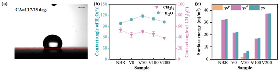 Figure 6. (a) Contact angle of V50-H2O; (b) water contact angle and diiodomethane contact angle of each sample; (c) surface energy of each sample.