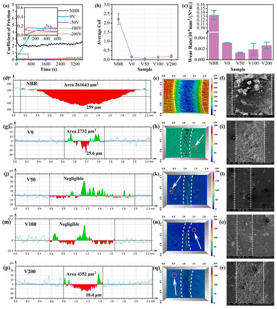 Figure 8. (a) Coefficient of friction of each sample; (b) average coefficient of friction of each sample; (c) wear rate of each sample. Wear depth cross-section and 3D wear trajectory morphology of N-DLC films on NBR with different bias voltages, NBR: (df); V0: (gi); V50: (jl); V100: (mo); V200: (pr).