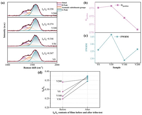 Figure 9. (a) Raman spectra of the wear marks of each sample; (b) G peak position of each sample; (c) FWHM of each sample; (d) ID/IG ratio of each sample before and after the friction test.