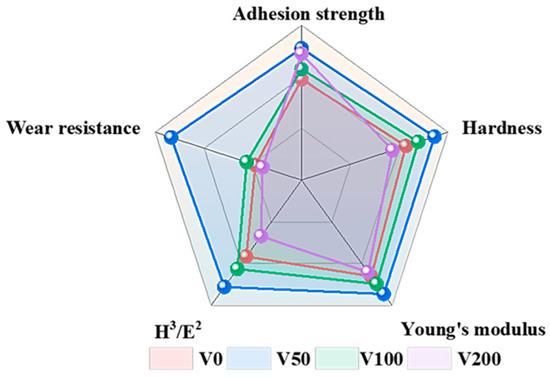 The mechanical properties of the film samples prepared under different bias pressures were compared, and comparison results were plotted in Figure 10. As illustrated in Figure 10, the mechanical properties of the V50 sample exceled in all aspects compared to those of other samples within the same group. It is noteworthy that the wear resistance index is derived by reciprocating the CoF.