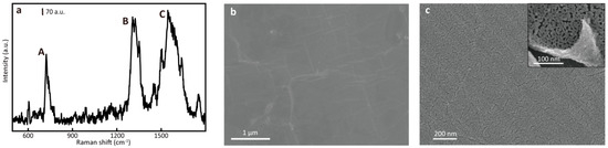 Graphene has been favored in various fields due to its excellent mechanical, electrical, and optical properties; moreover, it is often used as an ideal material for SERS substrates due to its excellent characteristics, such as the large specific surface area, significant CM capability, and effective background fluorescence suppression [16]. At present, graphene and noble metals with strong enhancement effects, such as Au, Ag, and Cu, are usually prepared into hybrid structures to build the SERS substrate [17,18]. Among these noble metals that are chosen frequently, Au has become a popular choice due to its high SERS effect, good biocompatibility, and tuneable optical properties [19,20,21]. Recently, various graphene–metal nanocomposites have been developed as SERS substrates and have shown superior application value. In Liang’s work, plasmonic and chemical enhancements were explored by comparing different graphene-based Au systems, such as CVD-G/Au, rGO/Au, and GO/Au; meanwhile, these systems were able to detect biomolecules of adenine with a low detection limit [22]. In Ghosh’s work, directed microwave-assisted self-assembly of Au nanoparticle dimers was used to build Au–Graphene–Au dimer SERS substrates [23]. In Raghavan’s work, the single molecule detection of dopamine and serotonin was achieved by graphene–Au nanopyramid heterostructure platforms [24]. In Stefan’s work, a novel method was reported for the label-free detection of cyanotoxin molecules based on a direct assay utilizing a graphene-modified surface plasmon resonance (SPR) aptasensor [25]. From these reports, it can be seen that the graphene–Au composite structure had an excellent performance in many properties during the Raman testing process, such as uniformity, stability, and biocompatibility. However, only a few graphene–Au SERS substrates can effectively combine all these advantages, which is mainly due to the fact that the performance of the graphene–Au composite structure is often constrained by the morphology and properties of the substrate. Usually, the achievement of corresponding and advantageous performance needs a specific structure, and it is difficult to merge several characteristics [26,27,28].