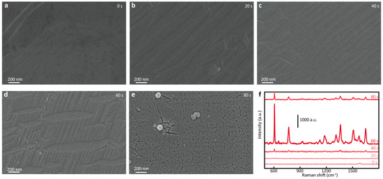 (a–e) The SEM images of G/Au substrates with Au sputtering times of 0 s, 20 s, 40 s, 60 s, and 80 s, respectively. (f) The Raman spectra of R6G with a concentration of 10−5 M collected on G/Au substrates with different sputtering times of Au.