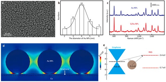 (a) The SEM of G/Au substrate; (b) the diameter of Au NPs; (c) Raman spectra of R6G collected from Au NPs and G/Au NPs; (d) simulated electric field distributions in different structures, and the cross section is at the y-z plane; (e) the charge transition channel.