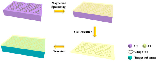 Graphene was grown on high-purity copper foil using the CVD method, and the carbon source gas was methane. By growing it in a hydrogen environment at 1000 degrees Celsius for 30 min, large-area continuous single-layer to double-layer graphene could be obtained. Then, a layer of Au was sputtered directly on the graphene-grown copper foil to obtain the G/Au film. The transfer of the G/Au film used a conventional wet transfer method, in which the above-mentioned copper foil was floated in a solution of iron chloride (FeCl3) and until the copper foil was completely etched. After that, a clean glass slide was used to transfer the G/Au film to deionized water to remove residual ferric chloride. After repeated cleaning 3 times, the G/Au film was directly drawn out using the target substrate and dried, and the transfer process was completed.