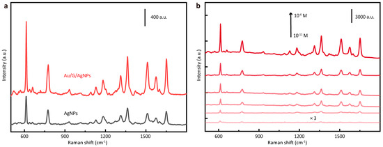 Through this transfer method and by selecting a suitable target substrate, the advantages of the G/Au film could be fully utilized. Moreover, a thin film tens of nanometers thick does not significantly affect the topography of the substrate and can provide additional Raman enhancement effects. A layer of Ag nanoparticles was dropped on the silicon wafer as the SERS substrate. Then, the G/Au film was assembled on the surface of the substrate, and the changes in its SERS performance were compared. The R6G solution with a concentration of 10−7 M was selected as the analyte, and the Raman spectra of pure AgNPs substrate and substrate covered with the G/Au film were collected and are shown in Figure 6a. From the comparison between the two, it can be seen that, after the assembly of the G/Au film, the intensity of each characteristic peak in the spectrum was significantly enhanced, which proves that the G/Au film can be assembled with other SERS substrates into a composite substrate and improve detection sensitivity. In order to quantify the enhancement effect of the substrate more intuitively, different concentrations of R6G solution were used for testing to explore the limit of detection. It can be seen from the Raman spectra (shown in Figure 6b) that the limit of detection of the substrate for R6G was 10−11 M, and the estimated EF was calculated to be about 6.80 × 107, which is stronger by several magnitude orders than the detection ability of the simple G/Au film substrate.