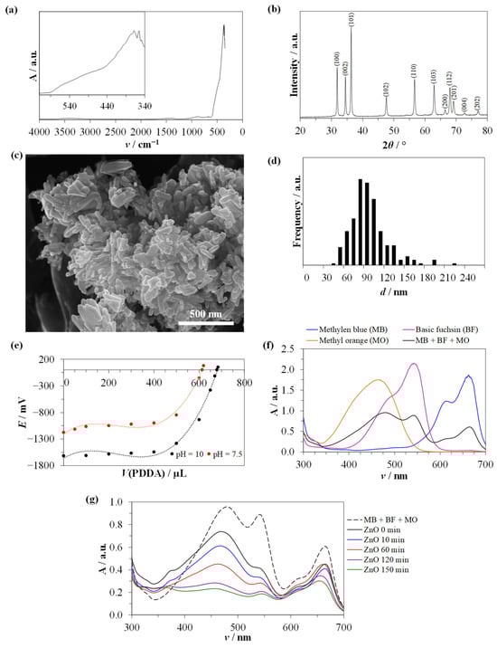 Characterization of ZnO NPs. Fourier-transformed infrared spectra (a) showing the absorbance at specific wavenumbers (ν/cm−1). X-ray diffractogram of ZnO NPs (b) with intensities assigned to (hkl) crystallographic planes at specific 2θ angles. Scanning electron microscopy images of prepared ZnO NPs (c). Particle size distribution (d) according to SEM analysis. Streaming potential (E/mV) of the ZnO NPs (e) in NaCl aqueous electrolyte solution as a function of PDDA volume at two different pH levels. Adsorption spectra for individual dyes and a mixture of dyes (f). Photocatalytic activity of ZnO NPs against dye mixtures at different incubation times (g). PDDA—poly(diallyl dimethylammonium chloride), MB—methylene blue, BF—basic fuchsin, MO—methyl orange, MB + BF + MO—mixture of individual dyes.