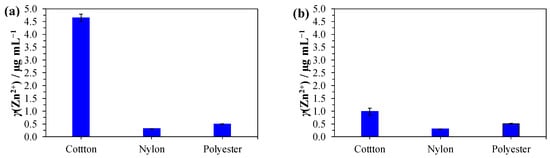 ICP-MS analysis of Zn2+ ions from the PAH/ZnO coated textiles: (a) after complete dissolution of ZnO NPs in acid and (b) after incubation in water for monitoring the ion release after 24 h. PAH—poly(allylamine hydrochloride).