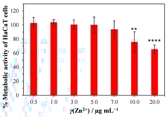 Metabolic activity of HaCaT cells under different concentrations of Zn2+ ions. The presented results are relative to the medium without Zn2+ ions. Significance was determined using a one-way ANOVA test with ** p ≤ 0.0054 and **** p ≤ 0.0001.