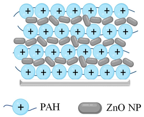 Textile (light gray line) coating with PAH polyelectrolyte layers and ZnO nanoparticles (gray rods). ZnO nanoparticles were applied between four PAH layers. PAH—poly(allylamine hydrochloride).