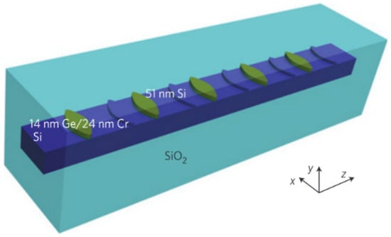 PT-symmetric optical structures. Periodically arranged 760 nm-wide sinusoidal-shaped combo structures are applied on top of an 800 nm-wide Si waveguide embedded inside SiO2 to mimic parity–time optical potentials, in which imaginary part modulation is implemented with 14 nm Ge/24 nm Cr structures and 51 nm Si layers are for real part modulation. Reprinted with permission from Ref. [28]. Copyright 2013, Springer Nature.
