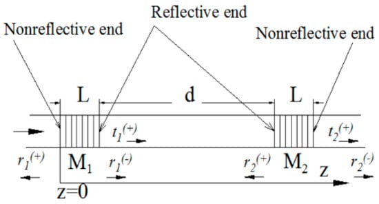 Schematic of a Fabry–Perot cavity composed of dual gratings; M1 and M2 are PT-symmetric unidirectional gratings and non-reflective ends placed in the cavity outwards. Reprinted with permission from Ref. [54]. Copyright 2013, Optical Society of America.