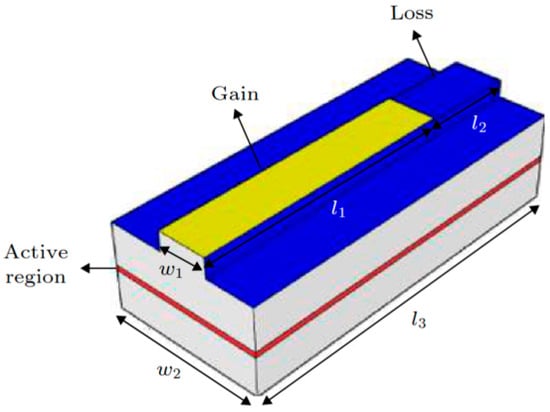 In 2020, Wang et al., at the Institute of Semiconductors of the Chinese Academy of Sciences [26] introduced the concept of PT symmetry in electrically injected semiconductor lasers with stripe structures. They analyzed the impact of the gain–loss structure symmetry on the PT symmetry-breaking phenomenon and demonstrated experimentally that PT symmetry breaking could lead to a doubling of the mode spacing in electrically injected semiconductor lasers. Figure 3 shows a schematic of this structure. The simulation and analysis initially focused on the effects of different loss-region losses on the PT symmetry-breaking threshold. The results showed that as the losses increased, the gain required for PT symmetry breaking decreased, and the mode degeneracy near the breaking point increased. The impact of different ratios between the gain and loss regions on the PT symmetry-breaking threshold point was further analyzed. The results showed that a smaller loss-region proportion leads to a higher gain requirement in the gain region to break PT symmetry. Finally, the PT symmetry-breaking phenomenon was experimentally observed in electrically injected semiconductor lasers. After reaching the threshold for the PT symmetry current, mode degeneracy and doubling of the mode spacing were observed.