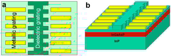In 2021, de la Perrière et al., of the Center for Nanosciences and Nanotechnologies in France [45,57] experimentally realized a DFB laser based on PT-symmetric dual gratings, with a central wavelength of 1550 nm. The laser structure used lateral ripple gratings to modulate the real part of the refractive index and deposited lateral metal stripes to modulate the imaginary part of the refractive index, as shown in Figure 4.