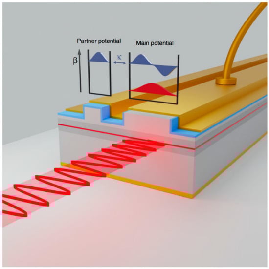 Therefore, traditional semiconductor lasers often sacrifice other characteristics to control the optical field [19,20,21,22,23]. To achieve high-power, high-beam-quality, single-mode lasers, researchers have begun to explore quantum-mechanical concepts. The Schrödinger equation in quantum mechanics and the Helmholtz equation in optical systems have formal equivalence, making their solutions analogous. Therefore, concepts from quantum mechanics, such as parity–time (PT) symmetry, can be utilized to control laser optical fields, providing the possibility of attaining the desired laser-system features.