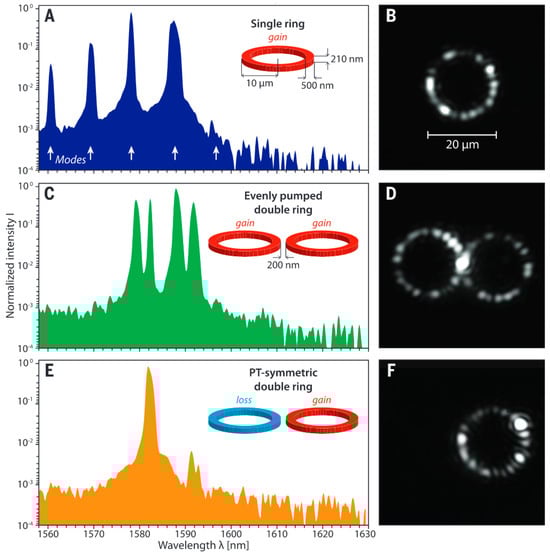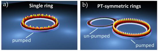 - Hayenga, W.E.; Garcia-Gracia, H.; Sanchez Cristobal, E.; Parto, M.; Hodaei, H.; LiKamWa, P.; Christodoulides, D.N.; Khajavikhan, M. Electrically pumped microring parity-time-symmetric lasers. Proc. IEEE 2020, 108, 827–836. [Google Scholar] [CrossRef]