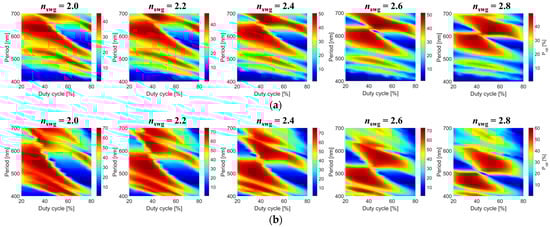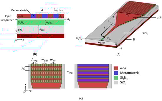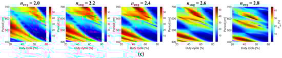 The α-Si grating coupler uses SWG metamaterial structures formed in the grating trenches to control the grating strength, as depicted in Figure 1c. Since the first demonstration of SWG metamaterials in Si waveguides, they have become an essential photonic design tool, yielding superior device performances [61,63,64]. SWG metamaterials enable the manipulation of light propagation by engineering the refractive index [26], dispersion [65], modal confinement [66], and anisotropy [67] of the medium. In our design, the device acts as a classical diffraction-based grating along the direction of light propagation, while the SWG structure is patterned along the transverse direction (Figure 1c, z-axis), interleaving the etched trenches and non-etched solid blocks of amorphous silicon. Since the feature dimensions are smaller than the operating wavelength, losses and wavelength resonances due to reflection and diffraction effects are suppressed. As a result, the propagating field interacts with the SWG as if it were a homogenous medium with a refractive index dependent on the geometry and constituent materials [61,64]. An equivalent refractive index is synthesized by varying the width of the unetched (wα-Si) and etched (wair) blocks, i.e., by optimizing the lateral duty cycle, which is defined as the ratio of the unetched segment and the SWG period. The SWG period is chosen as Λswg < ΛBragg = Λ/2nfb, to ensure that a photonic bandgap does not open at the central wavelength. Here, ΛBragg is the first-order Bragg period, Λ is the operating wavelength (Λ = 1.31 µm, in free space), and nfb is the effective index of the fundamental TE-polarized Floquet–Bloch mode in the grating region. Figure 2 shows the synthesized SWG metamaterials as a function of the SWG geometry. An SWG period of 400 nm was used for these calculations. The refractive index of the synthetic SWG metamaterial is calculated using a 2D multi-layer slab waveguide model in the x-z plane [26]. The final geometry of the SWG-engineered surface grating coupler, for both uniform and apodized designs discussed below, is then fine-tuned by rigorous 3D FDTD simulations.