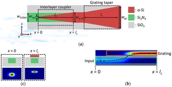 As illustrated in Figure 1, the grating coupler is implemented in the α-Si layer with light injection on the same plane. An inter-layer coupler is employed to transfer the light from the Si3N4 into an α-Si waveguide, as depicted in Figure 3a,b. In our hybrid platform, the thicknesses of the Si3N4, α-Si, and oxide buffer layers are fixed to 400 nm, 220 nm, and 50 nm. The Si3N4 thickness is given by the foundry [34], while the thicknesses of the buffer and the α-Si layers are optimized with respect to the grating coupler, as discussed in Section 3. The single-mode Si3N4 waveguide has a width (wSi3N4) of 850 nm. The input light from the Si3N4 waveguide is transferred into the upper α-Si waveguide through the evanescent tail of the propagating fundamental TE mode. To enable low-loss inter-layer coupling, we design a taper implemented in the α-Si layer. The 150 nm wide taper tip (wtip) ensures minimal back-reflections and compatibility with deep-UV lithography. By optimizing the taper geometry (taper length and final width), the undesired coupling into the higher-order modes can be avoided. The taper is gradually widened from 150 nm to a width wα-Si of 1 µm over a length lc of 60 µm. A side-view intensity profile of the inter-layer modal transfer is shown in Figure 3b, while mode profiles before (x = 0) and after (x = lc) the taper are plotted in Figure 3c. The transition efficiency between Si3N4 and α-Si layers is calculated to be 95% (insertion loss of −0.2 dB) at the 1.31 µm wavelength, according to our 3D FDTD simulations. Subsequently, the α-Si waveguide is tapered to a surface grating width (wgc) of 13.1 μm (Figure 1a). The width of the grating coupler in the z-direction is set to maximize the field overlap between the SMF-28 fiber mode and the dominant electric field component Ez. The waveguide-to-grating taper length (lt) is 200 μm, yielding a transition efficiency of 99%.