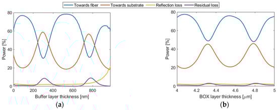 The radiation performance of the α-Si grating is governed by interference arising from reflections at the interfaces of buffer oxide/Si3N4 and BOX/substrate. Figure 5a illustrates the radiation characteristics of the grating as a function of buffer oxide thickness. It shows that up to 50% of the upward radiated power is dependent on the thickness of the buffer oxide layer. Similarly, the dependence of the radiation performance on the BOX thickness is plotted in Figure 5b. The BOX layer’s influence on directionality is less pronounced, with a maxima-to-minima variation of approximately 25%. In contrast to the oxide buffer, which is a free design parameter in hybrid photonic platforms [16,54], variation in the BOX thickness is typically not an option in many photonic substrates. Therefore, the reduced dependence of the directionality on the BOX thickness is a significant advantage of our design.