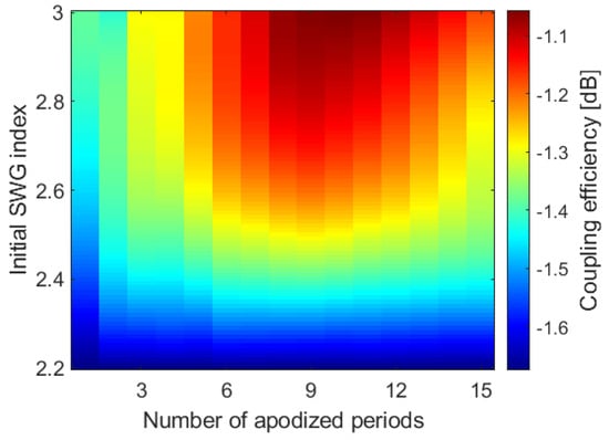 Further improvement of the coupling efficiency is achieved through SWG metamaterial engineering, which allows for a near-perfect mode match between the out-radiated grating field and the Gaussian-like optical fiber profile [26,36,42]. The apodization is performed by varying the refractive index of the SWG trenches along the direction of light propagation. This has the added benefit of lowering the effective index mismatch at the transition between the α-Si input waveguide and the surface grating, thus reducing back-reflections. Figure 7 shows a design map for the surface grating apodization obtained by evaluating the variation in coupling efficiency as a function of the number of apodized grating periods and the range of SWG metamaterial indices. The data were collected by conducting 2D FDTD simulations of the longitudinal cross-section of the device.
