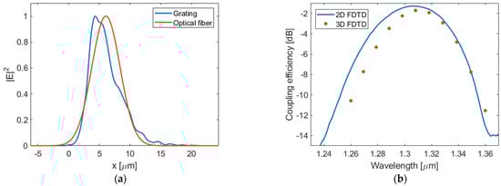 The optimized grating design has 7 periods in the apodized section followed by 23 periods with uniform coupling strength. The refractive index of the metamaterial trenches decreases from 3.0 to 2.2 in the apodized section, and the SWG period is 400 nm. The etched lateral gaps increase gradually from 28 nm to 163 nm. Although the calculated gap widths are limited by the SWG apodization profile [68,69], the utilization of ever-improving lithographic techniques with sub-50 nm feature size resolution, such as e-beam or immersion lithography [70], shows potential for faithful fabrication of many SWG-engineered devices in the future [64]. To keep a constant radiation angle, hence the linear phase profile of the out-radiated field, the grating period is chirped in a range from 590 nm to 691 nm over the full coupler length. The SWG-apodized α-Si surface grating has an improved fiber–grating field overlap of 96% and 92% according to 2D and 3D FDTD simulations, respectively. As a result, a total coupling efficiency of −1.7 dB is obtained at the nominal wavelength of 1.31 μm. The apodized grating design also yields a four-fold reduction in back-reflections, down to 0.8% (−21 dB). Figure 8a depicts a cross-section of the calculated intensity profiles of the SMF-28 fiber and the apodized grating field. The coupling efficiency as a function of the wavelength is plotted in Figure 8b. The optimized grating coupler provides 1 dB and 3 dB bandwidths of about 31 nm and 55 nm, respectively. Higher coupling efficiencies have been previously reported based on dual-layer configurations. However, they require thicker waveguide cores and metallic reflectors [54], or gratings etched into both the Si3N4 and Si layers, which complicate the fabrication process [53]. Our work represents an improvement of about 1.5 dB over standard grating couplers for Si3N4 photonics [27] while maintaining compatibility with a standard integration platform and a single-etch fabrication process.