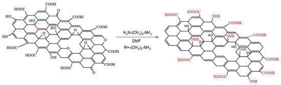 Graphene oxide (multilayer) was obtained by electrochemical (anodic) oxidation of dispersed graphite in sulfuric acid [32]. The surface modification was carried out using the chemical reaction of HMDA and electrochemically synthesized graphene oxide (GO). The probable interaction of graphene oxide with hexamethylenediamine occurs through the mechanism of nucleophilic substitution between the amino group of HMDA and the epoxy groups (-C-O-C-) of GO; the second possible process is the amidation of the carboxyl groups of GO, as shown in Figure 1.