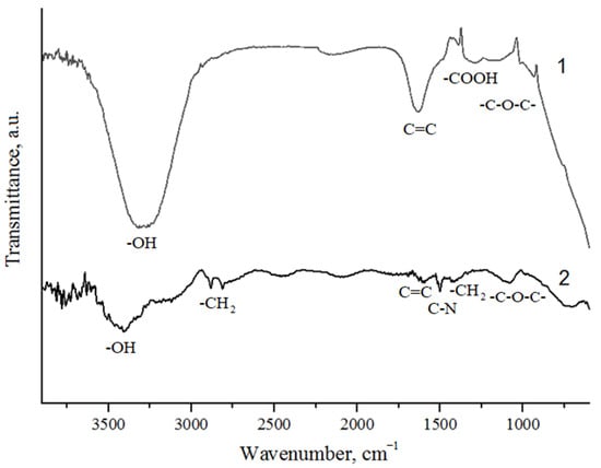 FT-IR spectroscopy: 1—GO; 2—GO-HMDA.