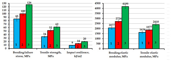 Deformation-strength characteristics of epoxy nanocomposites: 1—100 ED-20 + 40 TCPP + 15 PEPA; 2—100 ED-20 + 40 TCPP + 0.1 GO + 15 PEPA; 3—100 ED-20 + 40 TCPP + 0.1 GO-HMDA + 15PEPA.
