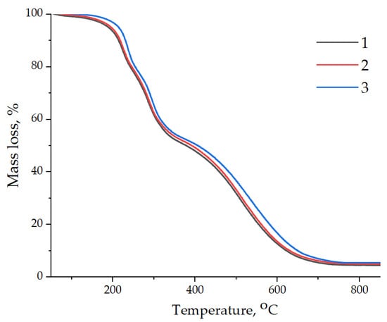 Data of thermogravimetric analysis of samples: 1—pristine epoxy composition without GO; 2—epoxy composition containing GO; 3—epoxy composition containing GO-HMDA.
