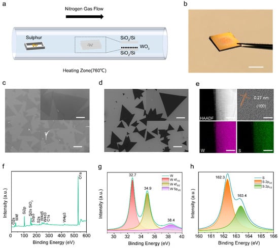 (a) Schematic diagram of domain-confined CVD system-grown WS2. (b) Photograph of a 300 nm SiO2/Si growth substrate with the as-grown WS2 films. Scale bar, 0.5 cm. (c) Optical image of the as-grown WS2. Scale bar, 100 µm. Inset: high magnification optical image of a triangular monolayer WS2. Scale bar, 40 µm. (d) SEM images of the as-grown WS2. Scale bar, 100 µm. Inset: high magnification SEM of a triangular monolayer WS2. Scale bar, 50 µm. (e) TEM images of the as-grown WS2 and EDS elements mapping images. The scale is 500 nm in low-resolution and 5 nm in high-resolution TEM graphs. (f) Full XPS spectra of the as-grown WS2. (g,h) XPS fine spectra of W and S elements.