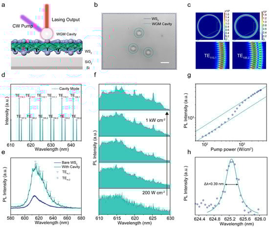 The lasing characteristics of the WS2 microlaser were studied via a homebuilt micro-PL system after introducing external cavities onto the as-grown WS2 films to construct the microlaser, whereby a 405 nm CW laser was focused down to 5 µm and functioned as the pump source. Figure 3a shows a schematic image of the WS2 microlaser. The high-quality optical resonant cavity can prominently enhance the light–matter interaction of the WS2 gain medium, thereby improving the resonant emission of the WS2 microlaser. Figure 3b shows the perfect circular boundaries and the ultrasmooth surfaces of the external cavities in the WS2 microlaser. Dispersed resonant cavities were distributed on top of the as-grown WS2 films on a 300 nm SiO2/Si substrate, which was selected to enhance the absorption and emission efficiency because of constructive interference and a reduction in the lattice distortion [34,35]. To identify the resonance of the laser structure, Figure 3c,d illustrate the simulated electric field distribution of the WS2 microlaser cavity as executed by the finite element method. The analysis only considered the transverse electric (TE). According to the mode simulations, strong and weak modes are associated with fundamental modes (TEm,1) and higher-order modes (TEm,2). Figure 3c presents the electric field profile for different mode numbers. The calculated mode positions distinguished the oscillatory peaks into two groups, as shown in Figure 3d. Experimentally, a series of sharp peaks were superimposed onto the broad emission spectra, which indicates that the external resonant cavity formed typical WGM resonant feedback (Figure 3e). Moreover, the emission intensity of the WS2 microlaser was approximately four times higher than that of the grown substrate, as intuitively seen in the PL intensity mapping image shown in Figure S3. This phenomenon can be attributed to the lensing effect, in which excitation energy is localized at the resonant cavity and WS2 interface, which can significantly improve the excitation efficiency and expand spatial overlap between the excitation and gain regions [36]. Additionally, the center wavelength of the WS2 microlaser exhibited a red shift of ~13 meV compared with the surrounding bare monolayer WS2. This red shift may be attributed to screening and strain effects caused by the resonant cavity [37,38,39]. For both the WS2 microlaser and the bare WS2, the frequency separation between typical Raman feature modes of E12g and A1g was 62.5 cm−1 (Figure S4), indicating that the strain effect can be ignored [40,41].