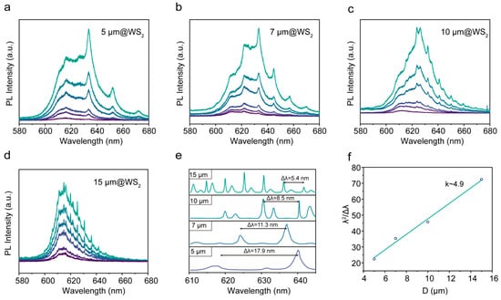 (a–d) Lasing spectra of the WS2 microlaser with 5 µm (a), 7 µm (b), 10 µm (c), and 15 µm (d) resonant cavities. The power density range varies from 200 W cm−2 to 1 kW cm−2, representing a progression from low to high. (e) The lasing spectra of the WS2 microlaser with four scale cavities were obtained by removing the fluorescence background for clarity. (f) Relationship between λ2/Δλ and D. The green line represents the linear fit of the data.