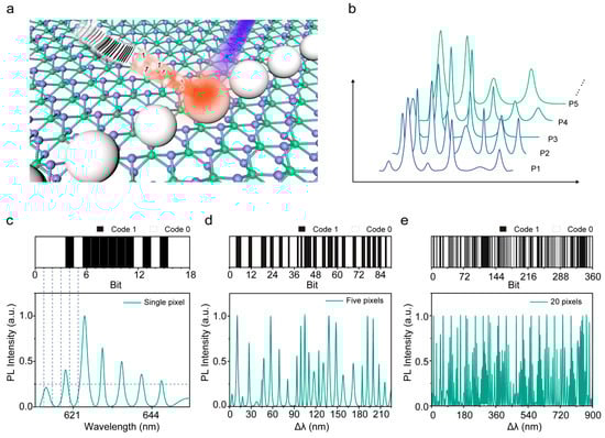 (a) Schematic diagram of encoding photonic barcode labels based on the WS2 microlaser. (b) The lasing spectra of different resonant cavities after removal of the fluorescence backgrounds. (c) Individual lasing spectrum corresponds to a photonic barcode label, with black squares specified as “1” and white squares as “0”. (d,e) Photonic barcode labels correspond to lasing spectra composed of 5 pixels (d) and 20 pixels (e).