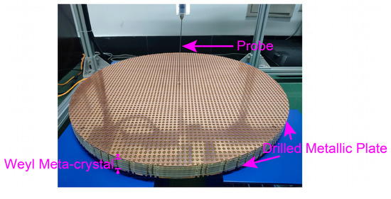The sample was fabricated by a commercial company named Shenzhen Sunsoar Circuit Technology (http://www.oem-pcb.com (accessed on 1 December 2023)) in Shenzhen, China, using the traditional printed circuit board (PCB) fabrication technology. The technological details include: FR4 material, board thickness 3.0 mm, copper weight 1oz, no solder mask and surface leading OSP (organic solder-anility Preservative). For the Weyl meta-crystals, each printed layer was paired with a 1 mm-thick FR4 blank layer to keep the printed copper structures from touching. The probe area consists of unit cells, whose lattice constants are and along the and axes, respectively. An air hole with radius was drilled at the center of each unit cell, providing the tunnel for the probe antenna to collect fields within the Weyl meta-crystal waveguide. The drilled metallic plates (electromagnetic lids) have a radius and a thickness .