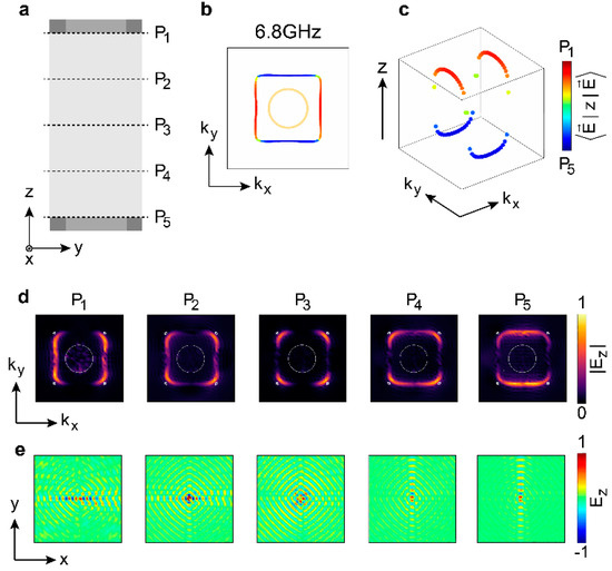 The experimental sample is illustrated in Figure 3. The microwave near-field scanning system is applied to probe the electromagnetic field, which is composed of a microwave vector network analyzer (VNA), two near-field antennas, and an xyz stage. To map the evolution of the propagating direction of the waveguide mode, we experimentally scanned 5 distinct positions within the ideal Weyl waveguide, which were referred to as to , as shown in Figure 4a. The waveguide mode at propagated along as shown in Figure 4b,c; the experimental probed band structure is shown in Figure 4d, with its real space field distribution in Figure 4e. Here, denotes the electric field, and is the weighted position of the mode distribution in the direction and is shown by a different marking color.